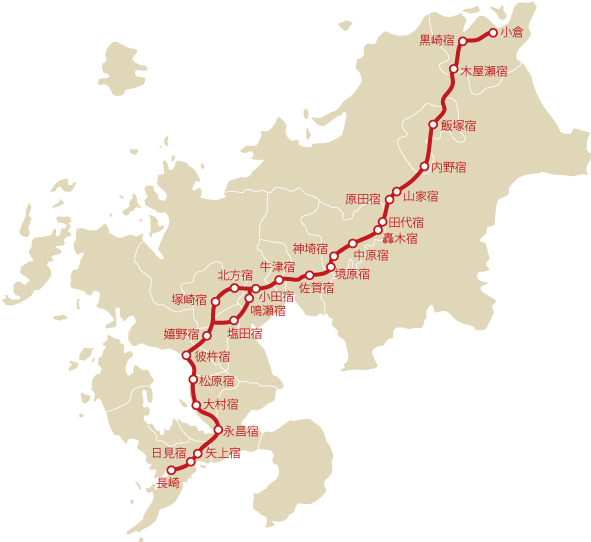 その行程は長崎から小倉までの57里(約228キロ)で、そのコースは、大体、長崎、日見(以上、天領)、矢上、永昌(以上、佐賀藩領)、大村、松原、彼杵(以上、大村藩領)、塩野、塩田、辺田、小田、牛津、佐賀、現原、神埼、中原、轟木(以上、佐賀藩領)、田代(対馬藩領)、原田、山家、内野、飯塚、木屋瀬、黒崎(以上、福岡藩領)、小倉(小倉藩領)でしたが、諫早と小田の間が福江、多良、浜、塩田、高(以上、佐賀藩領)など、別のコースもありました。